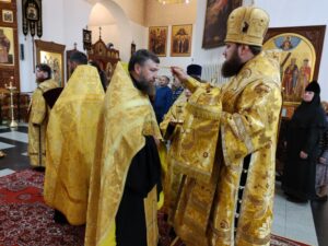 Его Преосвященству сослужили: секретарь епархии иерей Илья Кошляк и соборное духовенство.